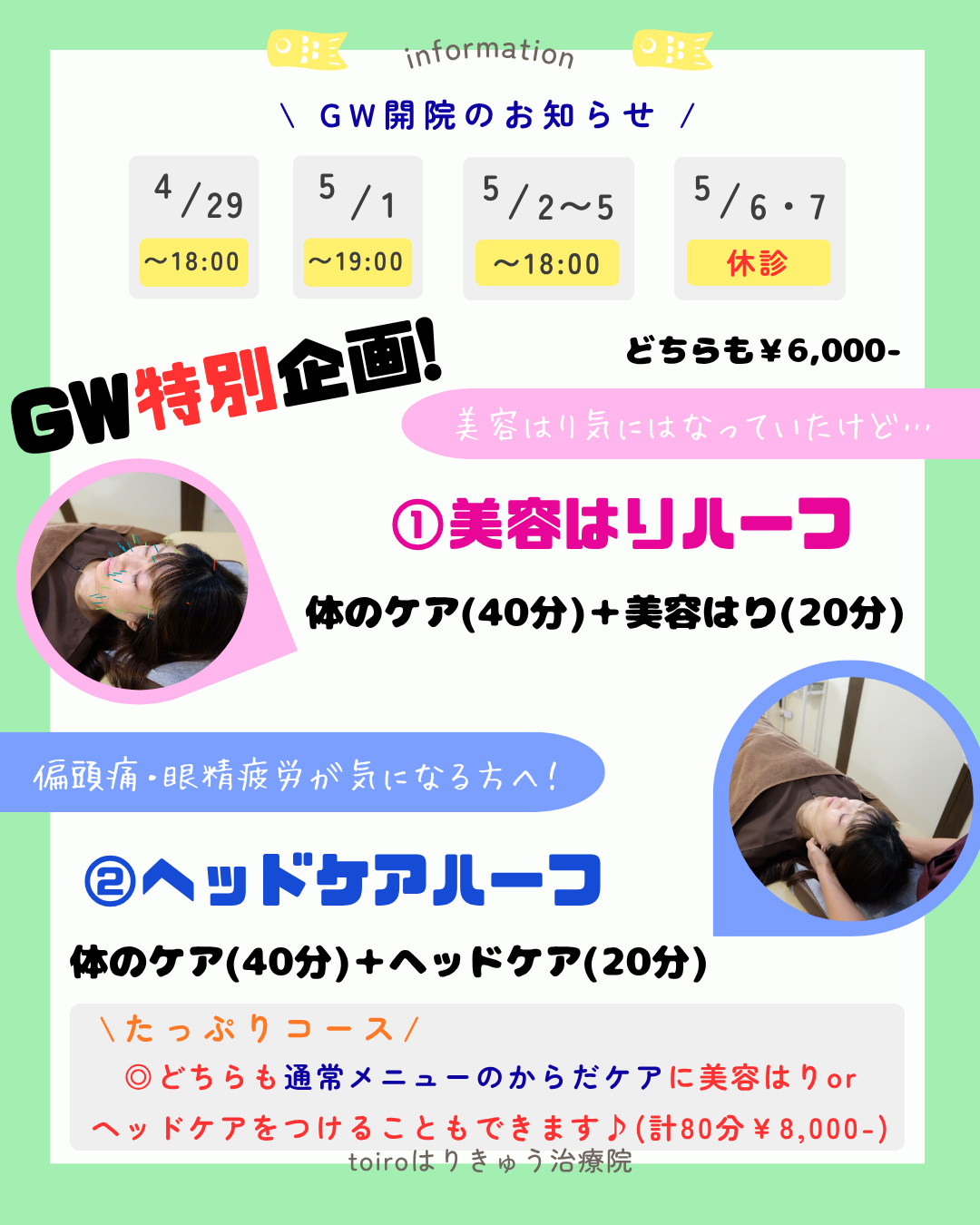 せっかくの連休、少しだけご自身の体のための時間を過ごしませんか?✨